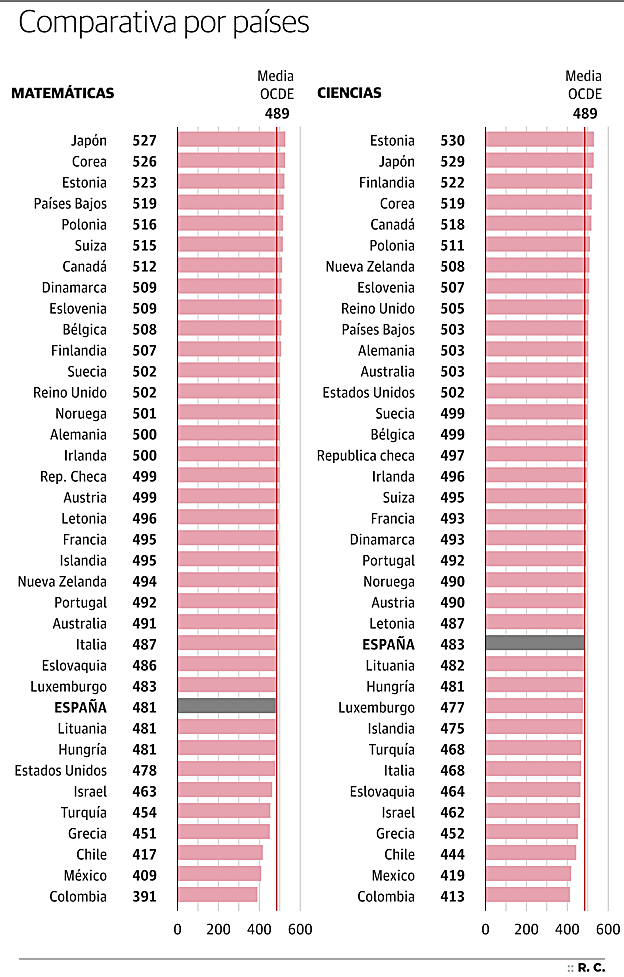 Los alumnos españoles, en el primer test PISA que los evalúa con la Lomce implantada en su integridad, obtuvieron de media 483 puntos en el examen de ciencias, diez menos que en 2015, con lo que lograron su peor nota en la materia en toda la historia de las pruebas y pasaron a estar seis puntos por debajo de la media de la OCDE. En el examen de matemáticas sacaron en conjunto 481 puntos, lo que supone cinco menos que hace tres años, uno de los peores resultados de la serie, y alejarse ocho puntos de la media de la OCDE después de que en 2015 lograron igualarla por vez primera.