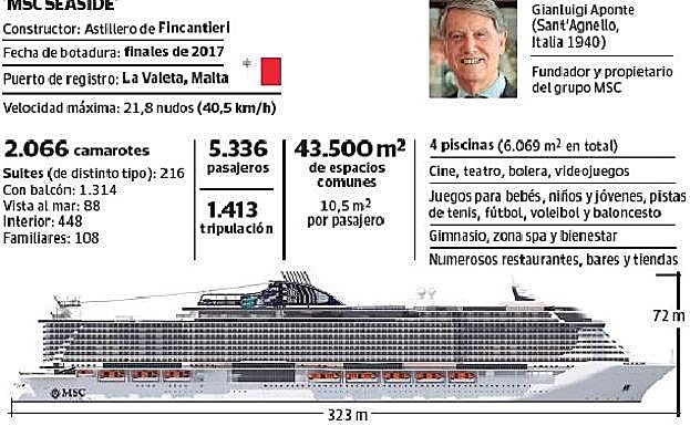 Hoy la contemplan cuatro, atracados en fila india. Su puerto de cruceros, el más importante del mundo -su supermuelle puede albergar a la vez hasta una decena de estos megalodones- bulle en las horas previas a levar anclas. El 'MSC Seaside' ha atracado a las siete de la mañana procedente de una singladura de una semana por el Caribe Oriental. A las siete de la tarde, se pondrá de nuevo en ruta para emprender una travesía de idéntica duración por el flanco Occidental. En apenas doce horas -su única tregua periódica desde su botadura, hace veintidós meses- debe despedir al pasaje, borrar las huellas de su paso por allí, recibir a la nueva remesa como si estuviera de estreno y cargar su bodega con todo lo necesario para que, además de la tripulación -1.413 personas de 40 nacionalidades-, la friolera de 5.336 viajeros procedentes de Kansas City, Dusseldorf, Bombay, Trento, Salvador de Bahía, Copenhague, Lyon o Barbate- coman y beban como si a su regreso a casa les aguardara un cartilla de racionamiento.