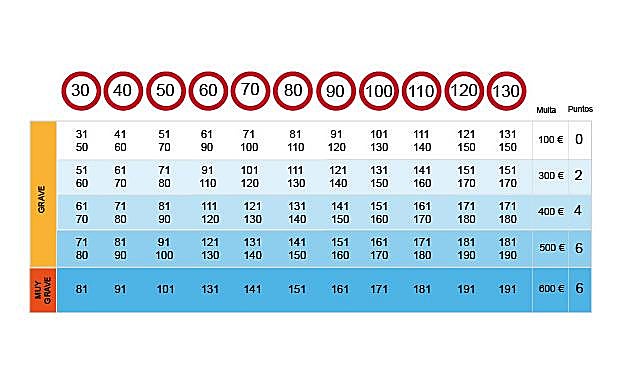 Superar el límite de velocidad: La penalización depende del límite establecido en la vía y de la velocidad que haya alcanzado el coche en el momento de la infracción. Aspectos que se detallan en la siguiente tabla: