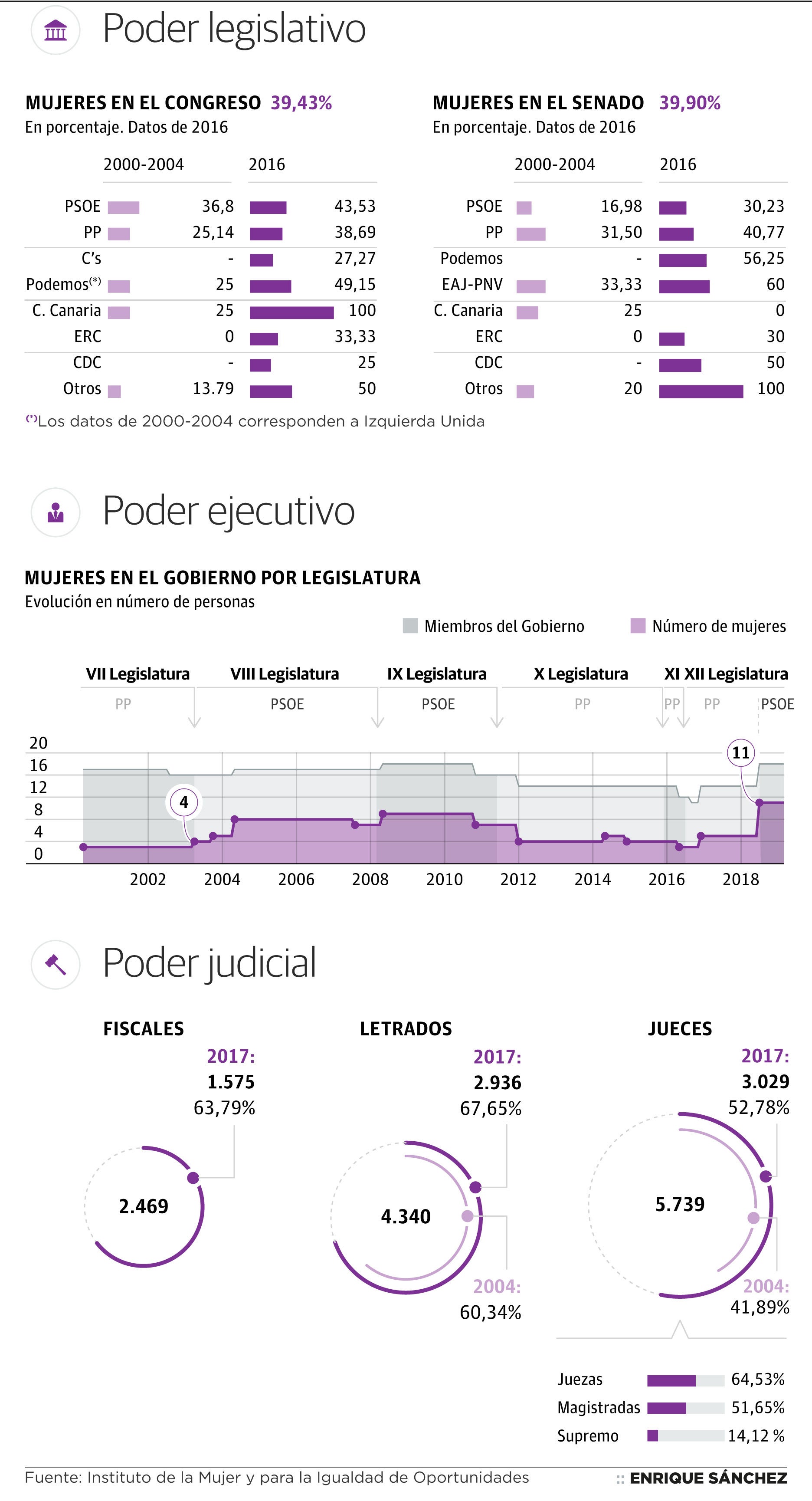 Su representación en la política y en la economía está lejos de la igualdadSólo el 19% de los ayuntamientos están dirigidos por alcaldesas; apenas el 14% de los magistrados del Tribunal Supremo son mujeres; en las Ejecutivas de los principales partidos políticos las mujeres representan de media el 38% pero todos sus líderes nacionales son hombres. El Gobierno de Pedro Sánchez ha sido el primero en el que el número de ministras ha superado al de ministros, pero en las próximas elecciones generales no hay candidatas a la Presidencia del Gobierno: se les ha reservado el segundo puesto y se muestra como un triunfo.