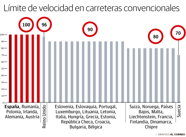 Dos son las medidas que se plantean para reducir estas cifras. Por un lado, incrementar el número de radares. Francia cuenta con 3.953 de estos dispositivos y Reino Unido con 7.200, mientras que en España funcionan 905 cinemómetros -fijos y móviles-. Por otro, reducir la velocidad máxima permitida en las carreteras convencionales y «para ello hemos abierto un debate» con la finalidad de «homologarnos -en velocidad- con otros países» europeos. ¿A qué velocidad se puede circular por estas vías en los diferentes países europeos? Como se aprecia en el gráfico adjunto, los 100km/h permitidos en España sitúan al país en el grupo más permisivo junto a Rumanía, Polonia, Irlanda, Alemania y Austria. A continuación se sitúa Gran Bretaña con 96km/h. Con 90km/h se sitúan países como Eslovenia, Portugal, Italia, Hungría, Croacia y Bélgica. Con 80km/h, Noruega, Suiza, Países Bajos, Francia o Dinamarca. Y finalmente, como país más prudente, Suecia, que ha establecido el límite en 70km/h.