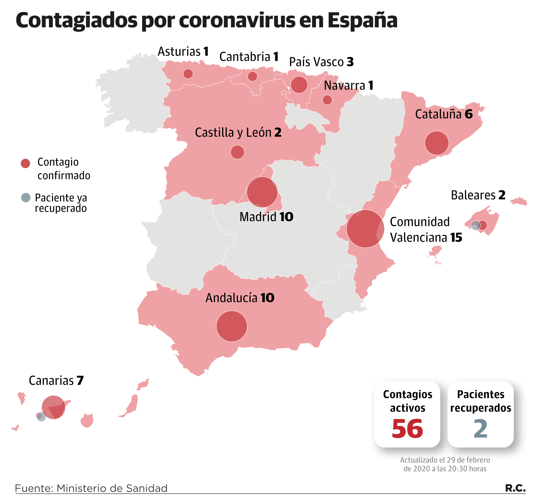 La distribución geográfica de la epidemia quedaba así este sábado por la noche: quince positivos en la Comunidad de Valencia; diez en Madrid, diez en Andalucía, seis en Cataluña, siete en Canarias, tres en Euskadi, dos en Castilla y León y dos en Baleares, además de uno en Navarra, otro en Asturias y uno en Cantabria. El caso anunciado el viernes en Aragón, finalmente, ha sido negativo.