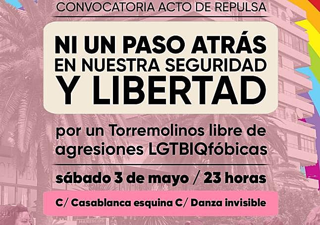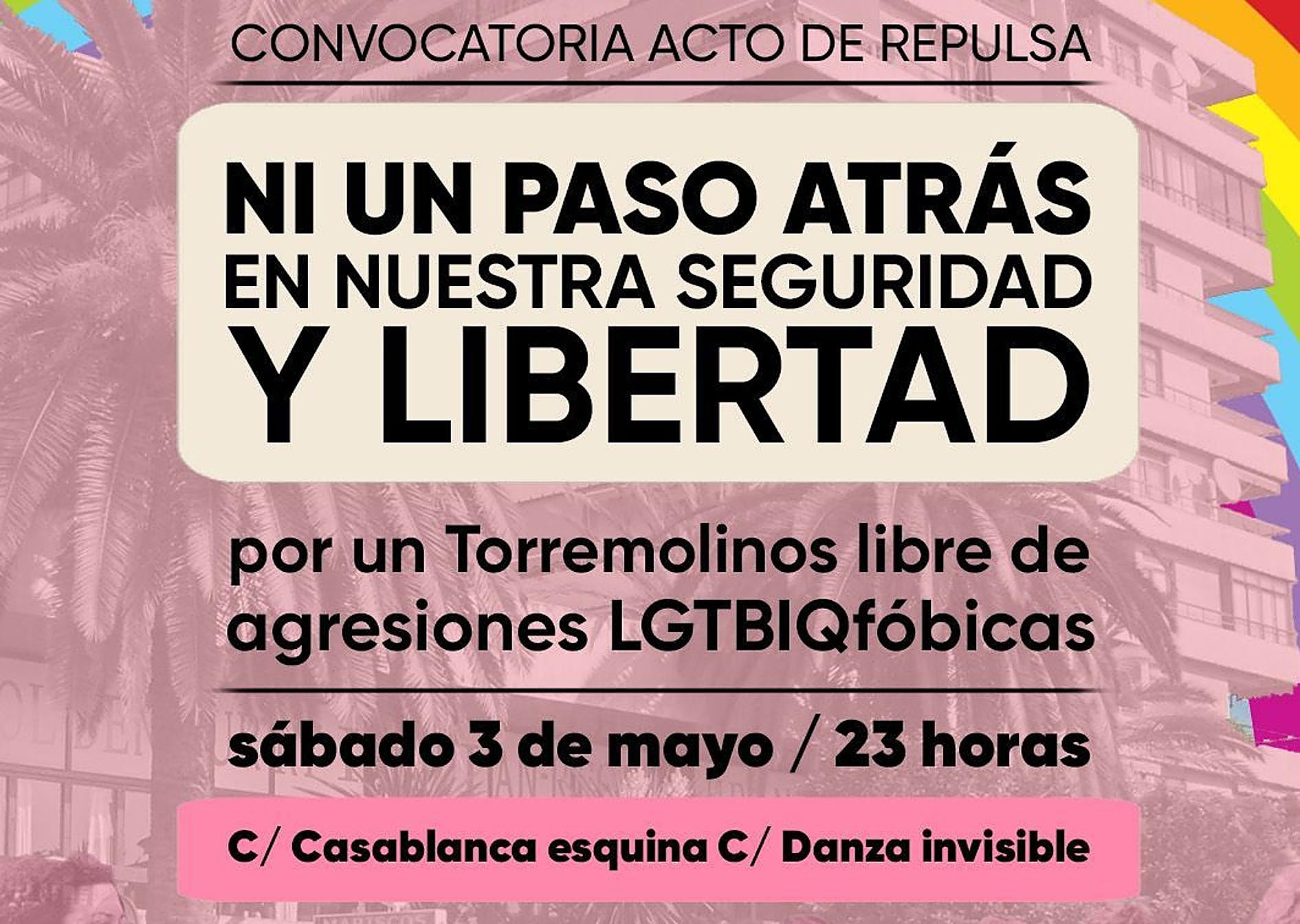 Por su parte, las asociaciones LGTBIQ+ de Torremolinos han convocado un acto para condenar lo acaecido este sábado 3 de mayo a las once de la noche. «Trae ruido y silbatos. Trae tu orgullo. No nos quedemos callados. Ni un paso atrás en nuestra seguridad y libertad. Por un Torremolinos libre de agresiones LGTBIQfóbicas», dice la convocatoria.