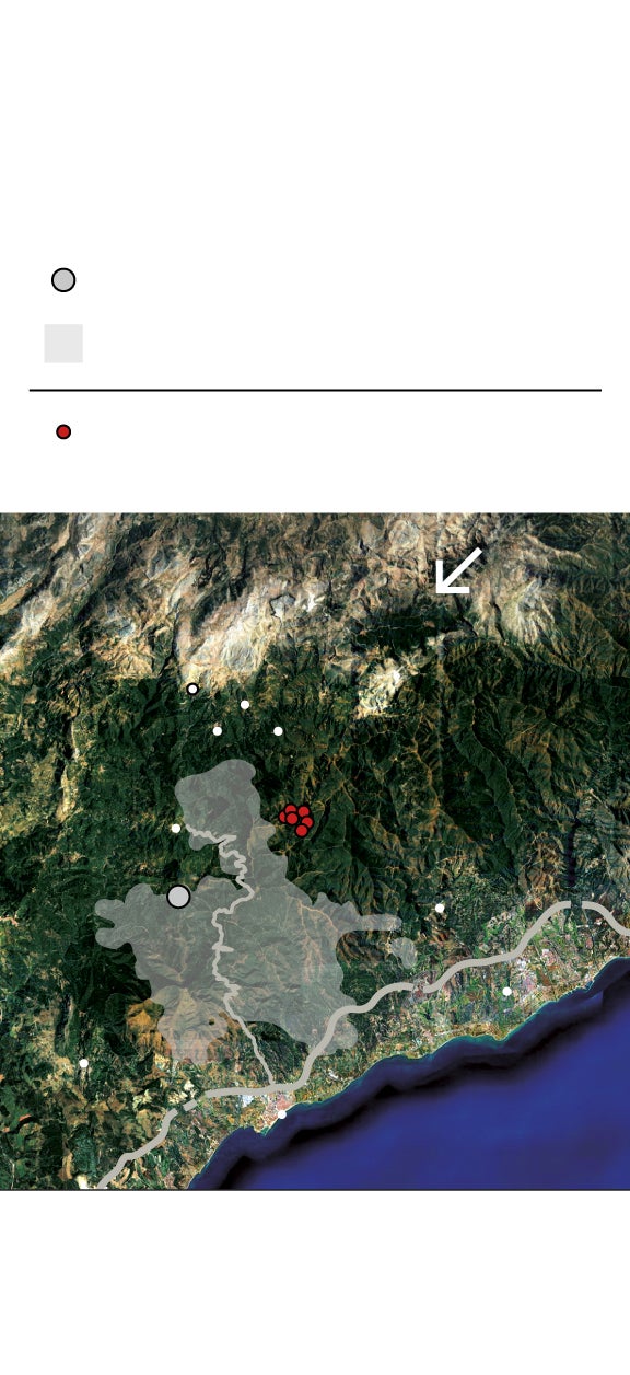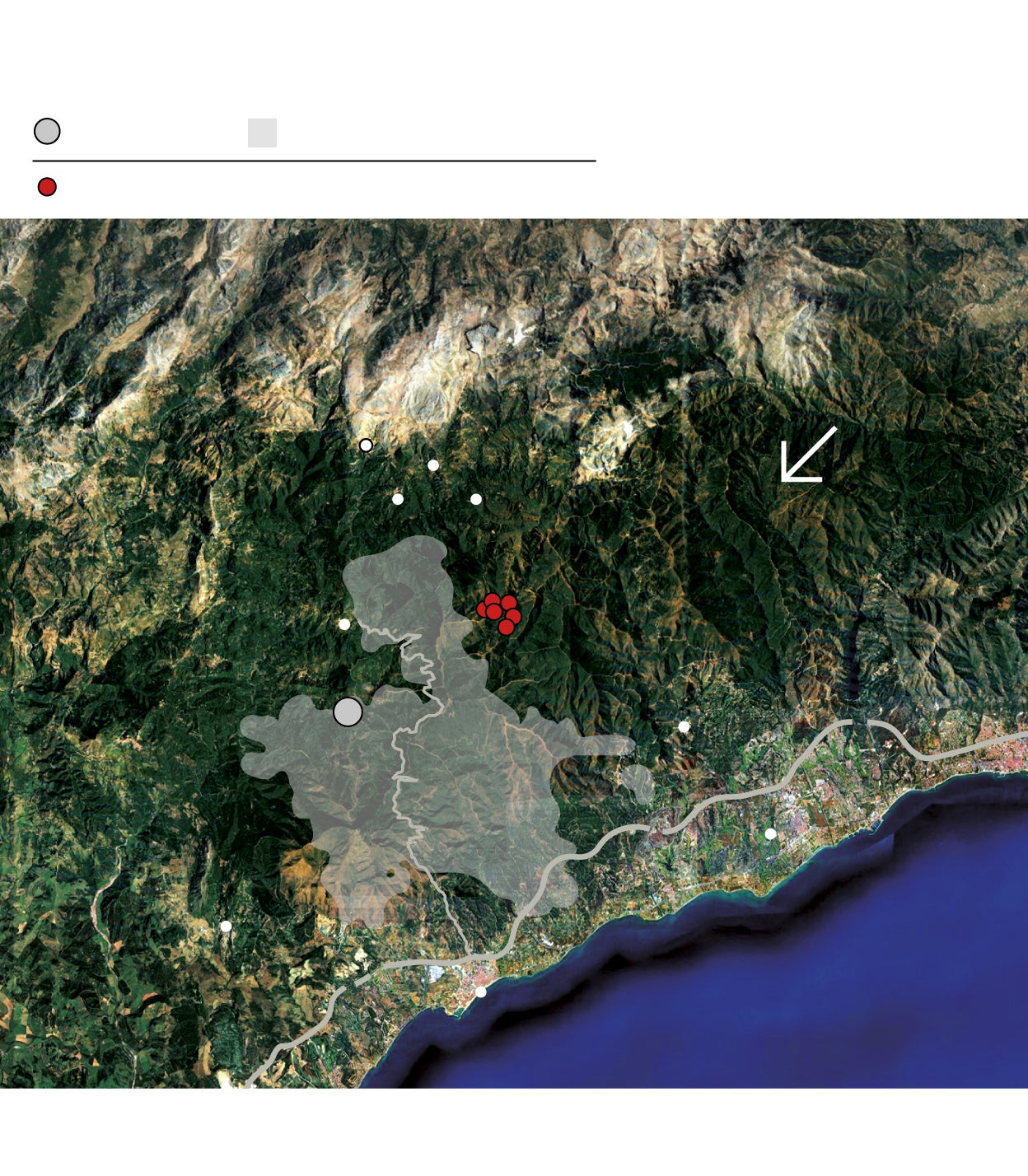 Según los primeros datos, el fuego comenzó en los baños, en la zona de La Corcha, en la finca de la resinera. Es un terreno donde abunda la peridotita, al igual que en Sierra Bermeja. El fuego comenzó con dos vertientes, la del Valle del Genal, que da al pueblo, y la otra que va hacia la costa, hacia Benahavís, y ahí es hacia donde va el fuego, hacia el mar.