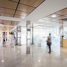 Un ejemplo clave de aplicación sería en los pasillos, ya que la circulación en hospitales normalmente ocupa un 20% de la superficie total construida. En un pasillo con aporte de luz natural, el control inteligente de la iluminación puede adaptar el nivel de la luz durante el día, beneficiándose de la luz natural que recibe del exterior; y durante la noche, el nivel de luz se puede atenuar, haciendo que recupere su intensidad normal, si detecta la presencia de personas en el pasillo.