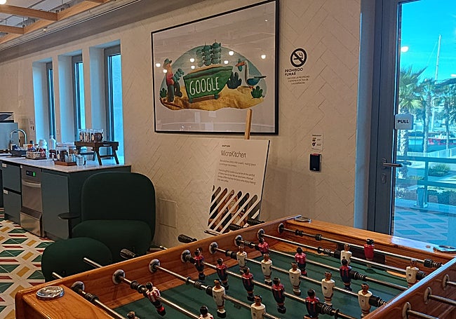 «La comida es muy importante en Google», reconoce la 'program manager' de GSEC Málaga, Paloma Simón, mientras enseña el comedor. No es sólo el lugar donde desayunan y almuerzan los 'googlers'; es un sitio de reunión e intercambio y está abierto a visitas. No en vano se dice que la mayoría de 'googlers' ganan algún kilo de peso en el primer año de trabajo en la compañía. «Intentamos que la comida sea saludable, de cercanía y ecológica», apunta Simón. Además del comedor, que extiende sus mesas hacia la terraza, los empleados tienen a su disposición una 'microkitchen', que es otra tradición en Google. Allí se pueden servir en cualquier momento un café o un refresco y picar algo.