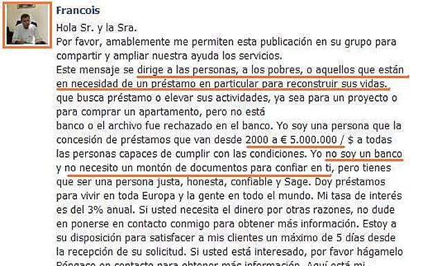 Este fraude circula principalmente en redes sociales y páginas de anuncios. Son anuncios o mensajes que ofrecen préstamos de dinero a usuarios a un interés muy bajo. Va dirigido especialmente a personas que necesitan dinero. Al solicitarlos robarán tanto el dinero como datos personales. (Más información, aquí).