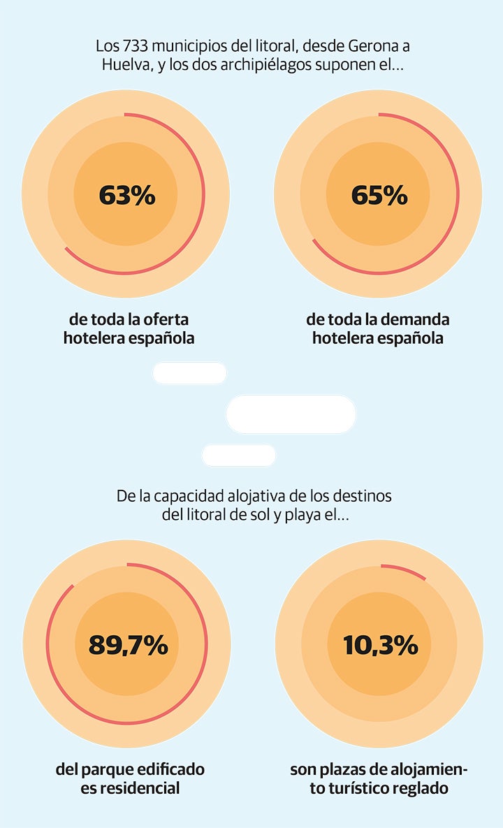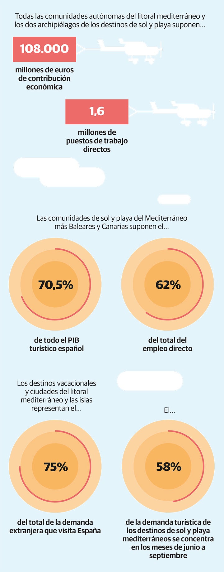 La fuerza de estos destinos se deja sentir en que, a pesar del crecimiento importante de otros segmentos y del alza que se prevé en el turismo de interior o de naturaleza con esta pandemia, representan el 65% del total de la oferta y la demanda turística en España.