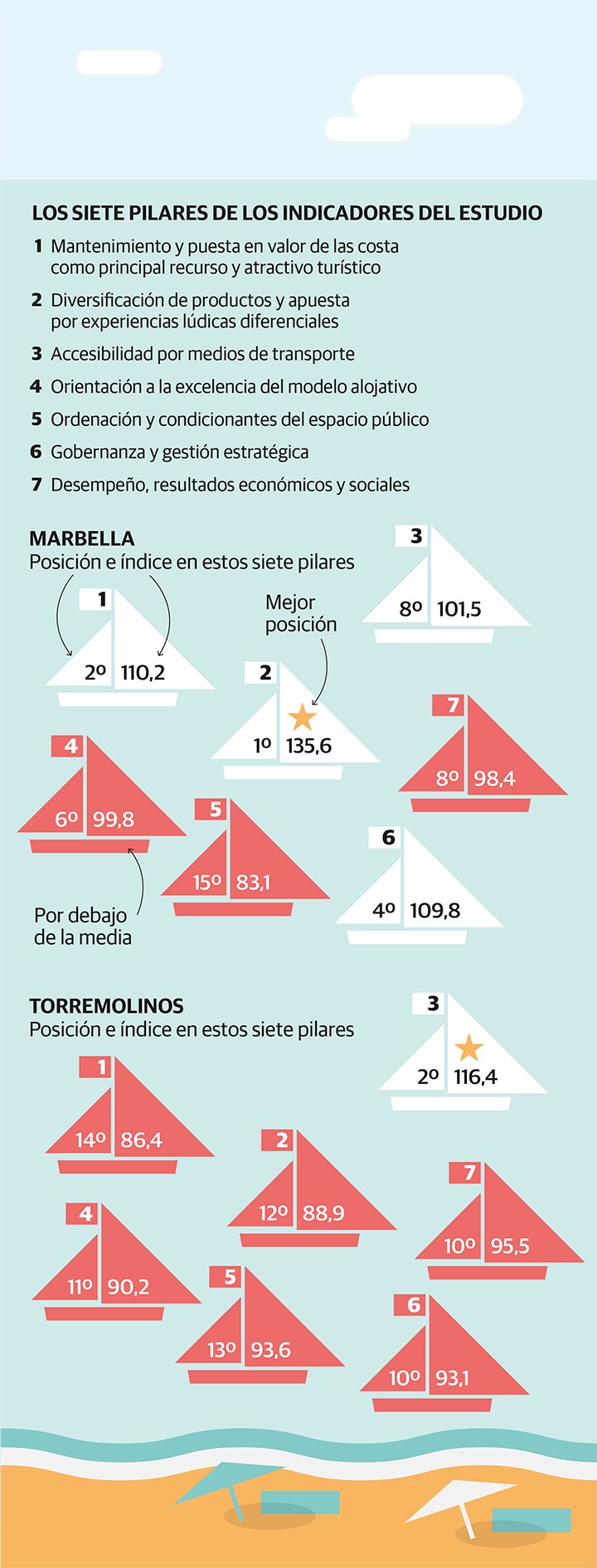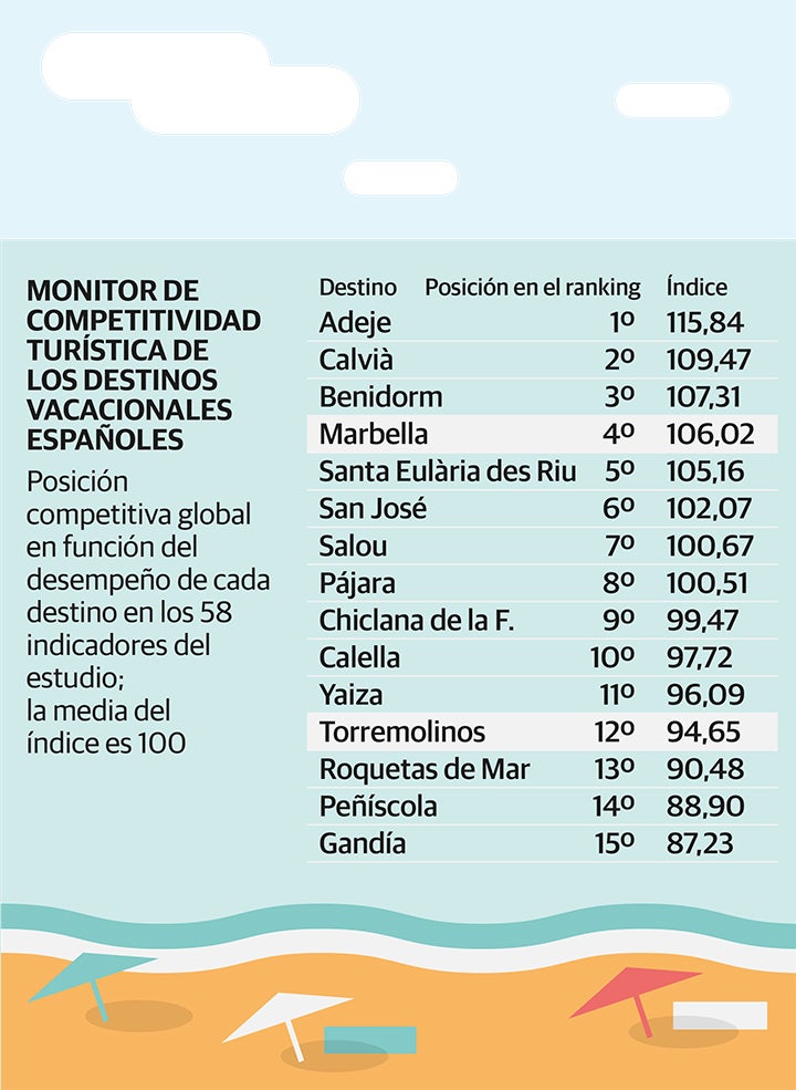 Este informe analiza los quince destinos más importantes, dos de ellos en la provincia malagueña, y señala a Marbella como el cuarto más competitivo de España, mientras que Torremolinos se sitúa en el puesto 12. Así se recoge en la primera edición del Monitor de Competitividad de los destinos de Sol y Playa español (SolyTur), en la que se destaca que los municipios de Adeje (Tenerife), Calviá (Mallorca), Benidorm (Alicante) y la malagueña Marbella son los que encabezan la posición competitiva global de los destinos turísticos nacionales de este segmento en base a 58 indicadores, entre los que destacan la puesta en valor de la costa como producto turístico, la diversificación de su oferta, su capacidad alojativa, su dotación de infraestructuras de transporte, el nivel de seguridad ciudadana y sanitaria, entre otros aspectos.