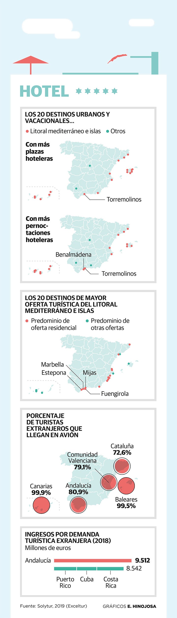El presidente de los hoteleros coincide en que la recuperación del destino está en manos del segmento de sol y playa, que atrae al 70% de los turistas y genera el 68% de las pernoctaciones, y que es el puntal de esta industria y no sólo en la Costa y en Andalucía sino en el conjunto del país. El primer informe que pone en valor el tirón y la vigencia de la oferta de sol y playa, realizado por la Alianza para la Excelencia Turística (Exceltur), incluye a Torremolinos y Marbella entre los destino más competitivos de España en este segmento y concluye que son protagonistas de la industria turística.