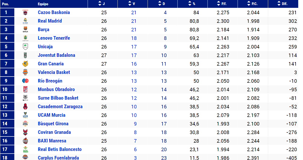A día de hoy, el cuadro de Los Guindos es quinto, con un balance de 17-9, pero ya sólo a una victoria del Tenerife (18-8), que sería su rival en los 'play-off' de acabarse ahora el torneo ya y sin factor cancha. Además, el Unicaj iguala a 17 victorias con el Joventut, pero tiene mejor 'basket average' y un partido menos disputado, porque el equipo catalán y el Gran Canaria han adelantado su duelo de la jornada vigésima octava, al estar ambos inmersos en la Eurocup.