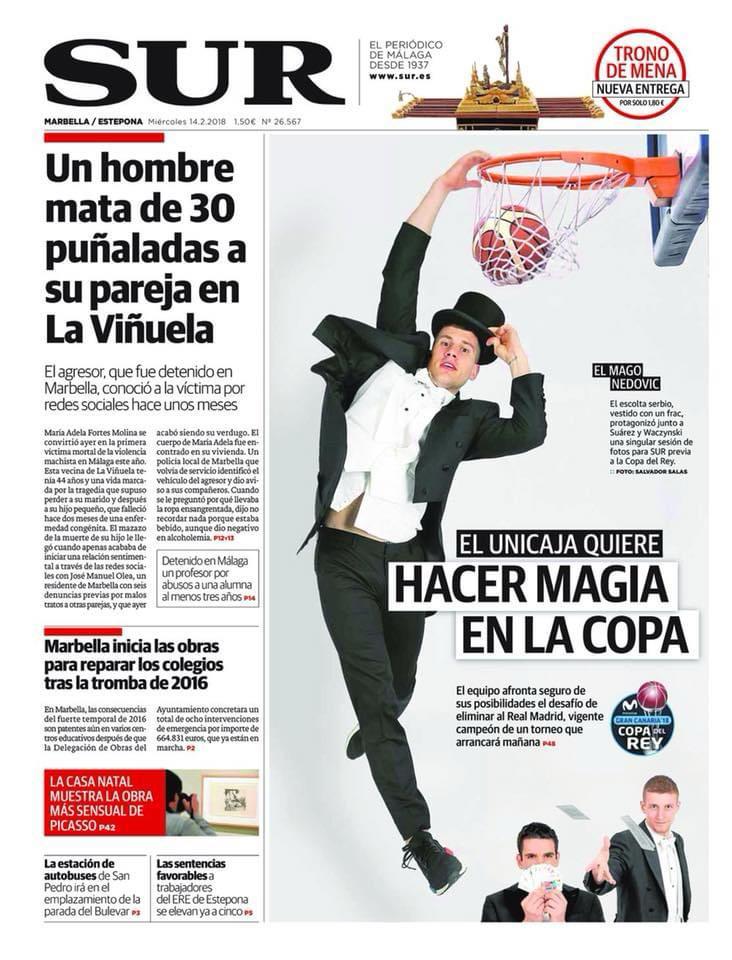 Ahí quedan algunas imágenes formidables como la de Nemanja Nedovic vestido de etiqueta, chistera incluída, machacando a una mano. Sepan ustedes que el balón y la canasta no aparecían en la fotografía original, pero Fran hizo su magia. Una vez abrimos la plaza de toros de La Malagueta para vestir de toreros a los jugadores con una temática taurina. Las imágenes en el callejón antes de salir al ruedo fueron formidables, y qué decir en aquella ocasión en la que metimos a medio equipo en una jábega en la playa de Huelin con Jayson Granger en la proa con una bandera de Málaga y una ventolera de poniente tremenda. De coleccionistas fue la imagen de la portada y la contraportada convertidas en una camiseta del Unicaja especial para la fnal de la Eurocup.