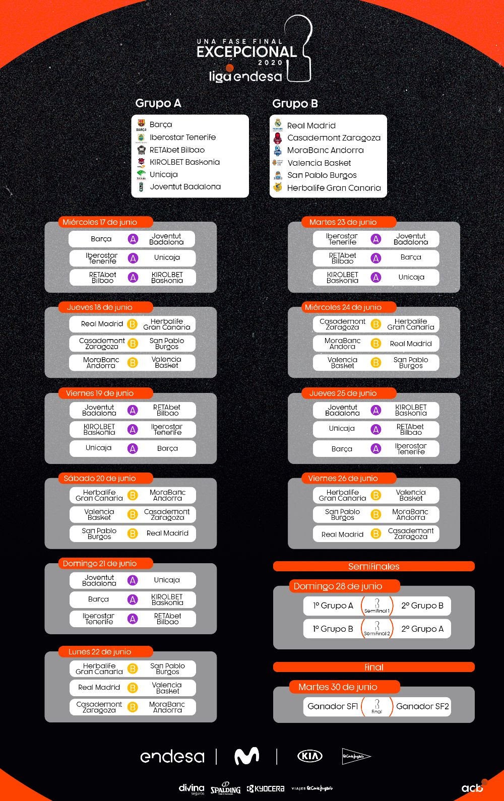 La liga hizo público el calendario completo de esta Fase -Final. Serán 33 partidos y ya se conocen los duelos de la fase de grupos que decidirán a los cuatro semifinalistas. El Unicaja no lo va a tener fácil. El conjunto malagueño quedó encuadrado en el grupo más complejo junto al Barcelona, Tenerife, Joventut, Baskonia y Bilbao. Por el otro lado del cuadro se verán las caras el Real Madrid, Valencia, Gran Canaria, Andorra y Casademont Zaragoza. La ACB ha fijado tres horarios de juego: 15.30, 17.30 y 21.30 horas. De este modo habrá baloncesto todo el día durante dos semanas. Todos los partidos se jugarán en el pabellón de la Fuente de San Luis y serán retransmitidos en directo por Movistar.