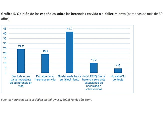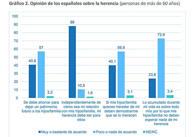 Aunque la mayoría está a favor de repartir la herencia tras su muerte, el estudio recoge formas de herencia en vida: el 51% afirma haber ayudado a sus hijos para salir de casa y un 37% había ayudado económicamente a sus hijos en el último año. Además, el 83% está a favor de proteger la herencia porque representa el esfuerzo de padres a hijos, y un 61% es partidario de eliminar el impuesto de sucesiones. No llega al 10% quienes refieren haber tenido algún conflicto familiar vinculado a una herencia, pero preguntados de forma indirecta, si conocen algún caso en su círculo familiar cercano, un 33% afirma que conoce alguno y un 12%, muchos.