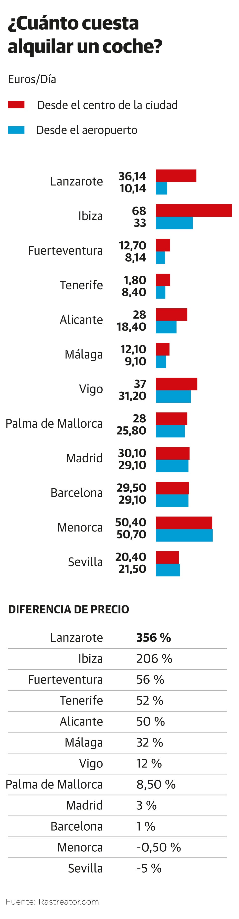 Si tiene pensado alquilar un coche durante sus vacaciones de verano, tenga muy en cuenta el lugar de recogida del vehículo antes de comprometerse con ... ninguna empresa. La diferencia de precio entre cogerlo en el centro de la ciudad en cuestión o en el aeropuerto es tan significativa en algunos casos que le dará incluso para pagarse unas cuantas cenas. En Lanzarote, por ejemplo, la diferencia de tarifa es de más del triple, según se desprende de un estudio realizado por el comparador de precios Rastreator en una docena de capitales españolas. En solo una semana de vacaciones en la isla canaria, un conductor se puede llegar a ahorrar hasta 180 euros solo por cambiar el lugar de retirada del vehículo de alquiler. Haga cuentas. La tarifa media que se cobra en el aeropuerto canario es de 10,14 euros al día, frente a los 36,14 que tendría que pagar si recogiese el mismo coche en Arrecife.