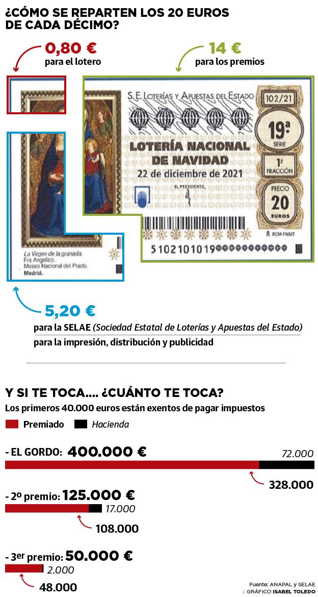 Si se cobra habrá que hacer antes cuentas con Hacienda, claro. Los primeros 40.000 euros están exentos, pero de ahí para arriba se aplica un 20%. Ahora solo queda confiarse a la suerte... o a 'La Virgen de la granada', obra de Fra Angelico que acoge el Museo del Prado y que es la imagen de los décimos de Navidad este año.