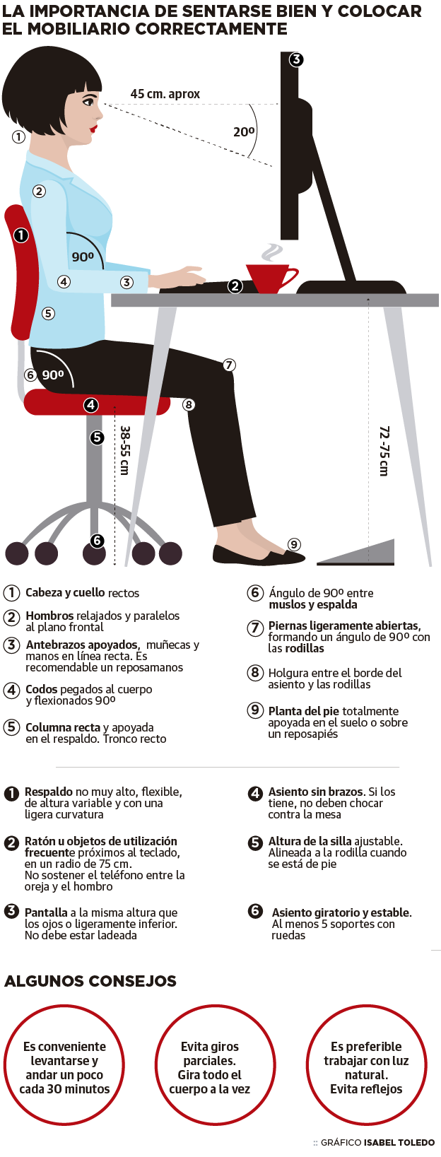 Los manuales de ergonomía mantienen que la mejor silla para trabajar es la que podemos ajustar a nuestro cuerpo para sentarnos de la mejor forma posible. «Es recomendable regular la altura del asiento de manera que nos permita mantener las rodillas dobladas en ángulo recto, además de acomodar bien la zona lumbar en el respaldo. Y, ojo, las piernas nunca deben quedar colgando. Si no llegamos al suelo, lo más práctico es colocar un reposapiés», resumen en el Colegio de Fisioterapeutas de Cataluña.