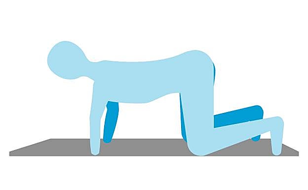A cuatro patas, rodillas en el suelo, pies sobre las puntas, brazos apoyados por las palmas en el suelo, a la altura de los hombros y las manos enfrentadas con los dedos abiertos. Cabeza en la línea de la espalda. Respiración con el pecho y exhalación completa hasta quedarnos sin aire. Y repetimos la operación, abrimos escápulas, contraemos suelo pélvico y llevamos ombligo a la columna.