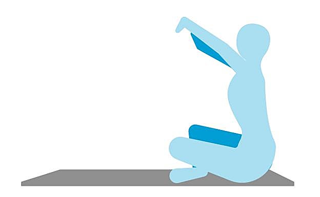 Sentados con las piernas cruzadas, elevamos los brazos y los colocamos ligeramente flexionados a la altura del pecho con las manos enfrentadas, dedos abiertos. Escapulas separadas. Cogemos aire y lo expulsamos totalmente. Abrimos costillas, elevamos suelo pélvico y metemos la barriga intentando llevarla hacia la espalda.
