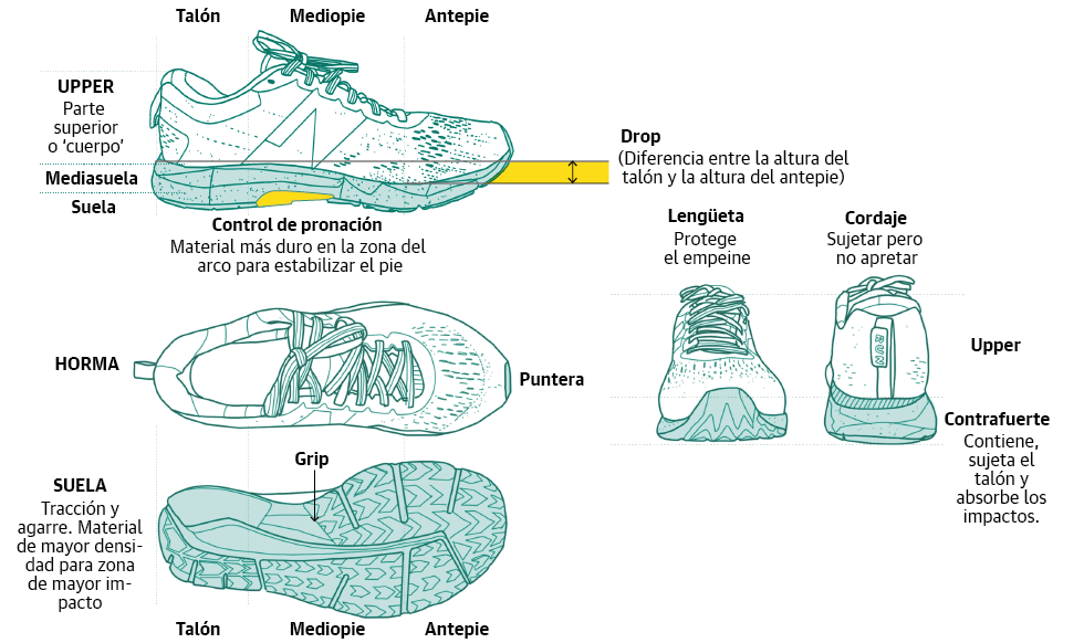 El riesgo de comprar una talla justa es que las uñas choquen contra la puntera, se pongan negras y se caigan. Debemos también tener en cuenta que la horma es más estrecha en las deportivas para mujeres. Los materiales deben ser transpirables y es preferible que las lengüetas sean acolchadas, ya que tienen la función de proteger el empeine. Debe ajustarse bien para que el pie realice una correcta flexión dorsal de tobillo. El último agujero de los cordones de nuestra zapatilla va a evitar que la lengüeta se mueva.