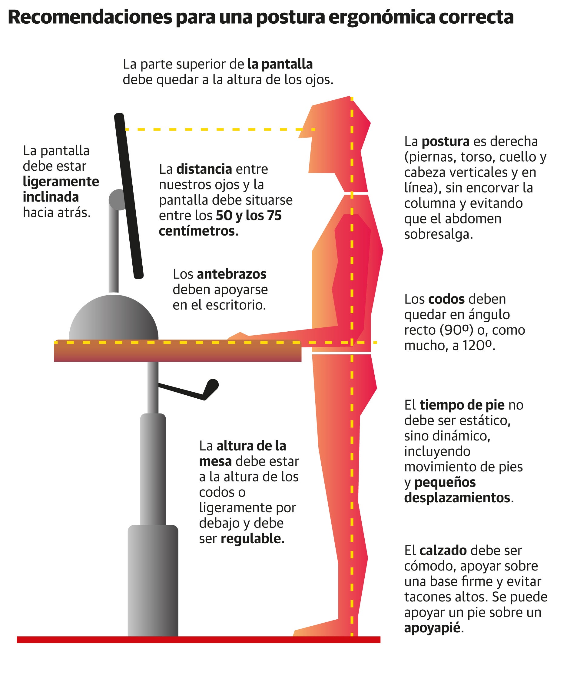 La solución para que un oficinista trabaje de pie pasa por una mesa alta que quede a la altura de los codos, «que deben dibujar un ángulo recto de 90 grados, con los antebrazos apoyados en el escritorio», indica Mónica Coccoz. «La pantalla debe quedar al nivel de los ojos». Ya se fabrican mesas de este estilo y otras elevables que todavía tienen más salida, ya que permite trabajar sentado o de pie. «El artículo más demandado es la mesa elevable Multilevel, que permite trabajar sentado mientras realiza un tarea individual concentrado y elevarla para mantener un intercambio rápido de ideas con compañeros. La mesa se sube y se baja de forma rápida y silenciosa y se regula de forma independiente con mandos programables», explica Camilo Agromayor, director general de Ofita, firma de Vitoria dedicada a la fabricación de muebles. Las ventas de este tipo de mobiliario elevable confirman que «alternar el trabajar de pie y sentado» es tendencia, y han vendido el nuevo equipamento «a empresas dedicadas al sector de la banca, despachos de abogados, agencias de publicidad...».