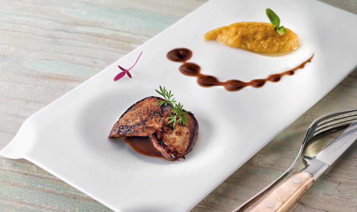 4. Se escurren las pechugas de la marinada. Se doran en una sartén por el lado de la piel y unos segundos por el de la carne. Se acompañan con el puré de calabaza y el jugo de codorniz bien calientes.