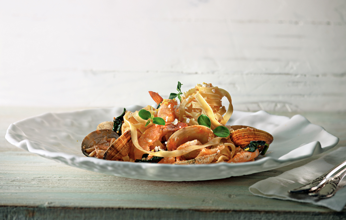 2. Hacemos después lo mismo con las almejas y salpimentamos. Posteriormente, en la misma sartén, salteamos también las espinacas y el tomate. Cuando la pasta esté ya cocida, mezclamos todos los ingredientes y, si así lo deseamos, estiramos un poco la salsa con el agua de cocción de la propia pasta.Acabado y presentación.