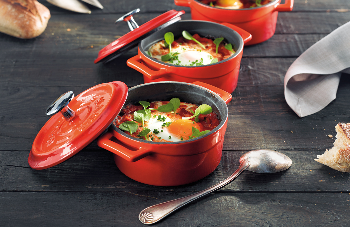 En una sartén con una pizca de aceite damos unas vueltas a las espinacas (unos segundos) hasta que pierdan volumen sin perder su aspecto verde. Sazonamos, las acomodamos en cazuelitas, cubrimos con el sofrito y hacemos unos pozos con el dorso de una cuchara, para cascar en su interior un huevo. Salpimentamos. Metemos las cazuelitas al horno y dejamos que cuajen las claras ligeramente. Las yemas deben quedar jugosas, sin que se sequen.