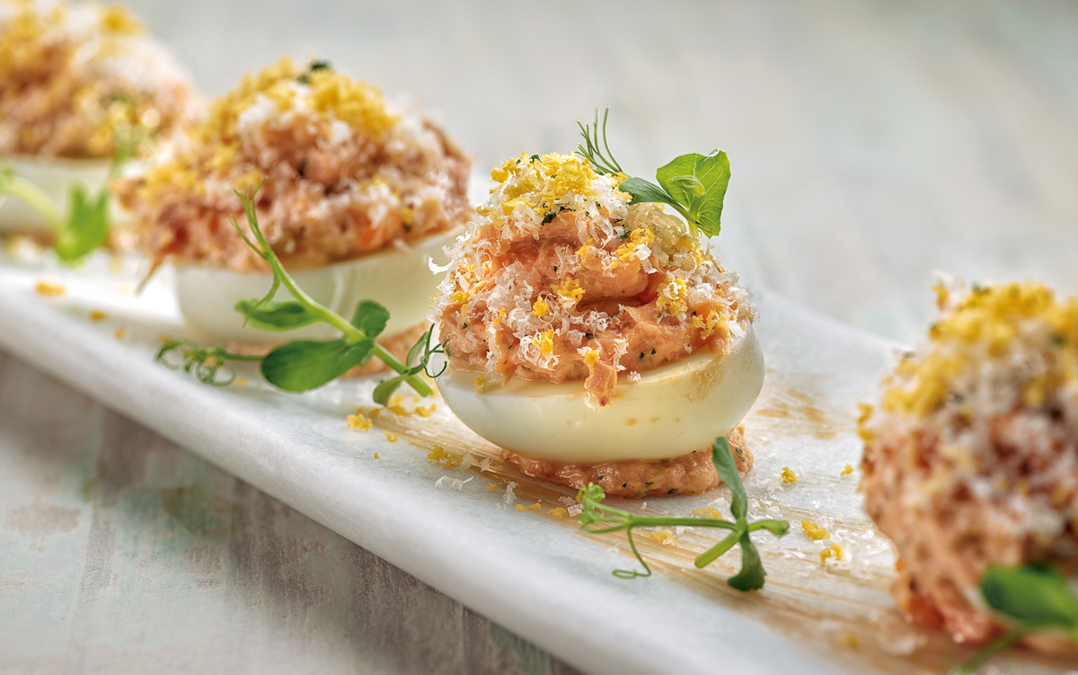 Sobre una tabla, con un cuchillo bien afilado, se pica el salmón en dados bien finos y se añade sobre las seis yemas. Se desmenuza el bonito con las manos y se incorpora al bol, mezclando con las púas de un tenedor, removiendo bien. Entonces se añade el resto de los ingredientes, el líquido de los pepinillos, los pepinillos, la salsa mayonesa, el kétchup, el zumo de limón, la salsa Worcestershire y el perejil picado. Se remueve bien, integrando todos los elementos, y se rectifica el sazonamiento con cuidado, teniendo en cuenta que finalmente los rallaremos con el queso, lo que le dará también una buena sazón. Se enfría la mezcla antes de rellenar los huevos.