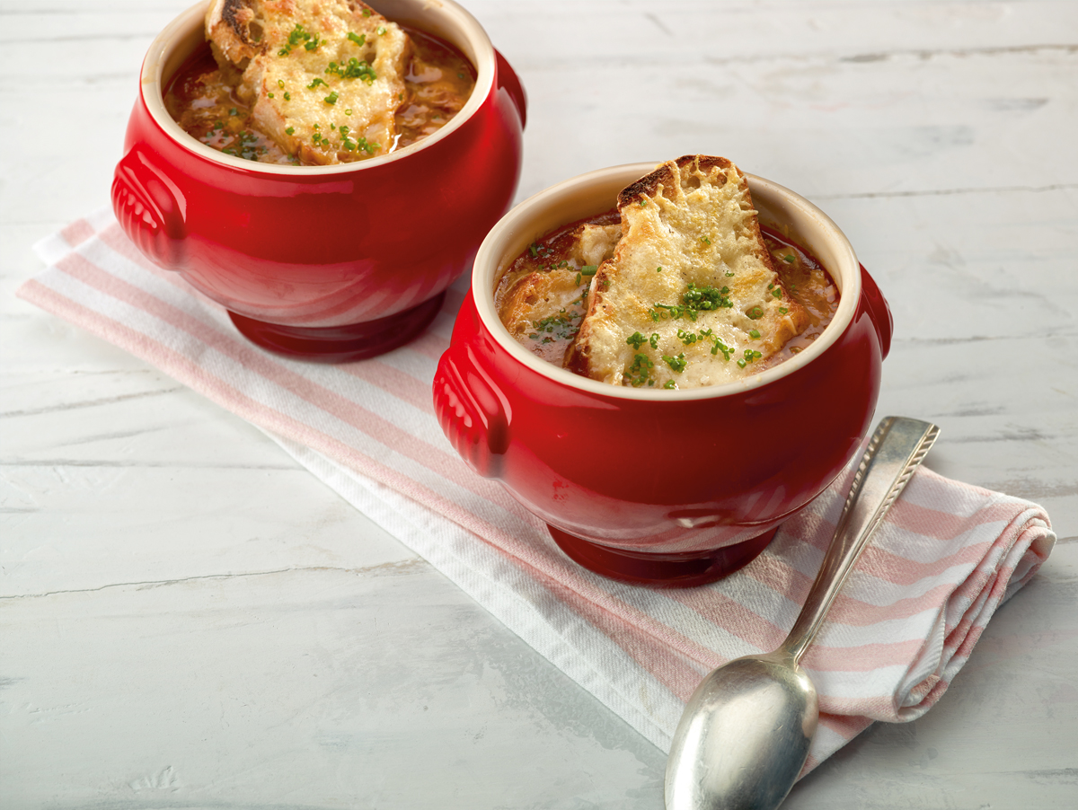 4. Se vierte la sopa en las pequeñas soperas o en una grande. Se colocan las rebanadas de pan sobre las soperas y se espolvorea con el queso. Se hornean unos minutos para que gratinen y ¡listo!