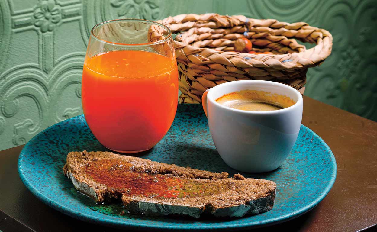 «Un zumo de naranja, que me da la vida, una tostada con ajo y aceite de oliva y un café con leche. Nunca tomo ni jamón ni huevos ni embutidos…».